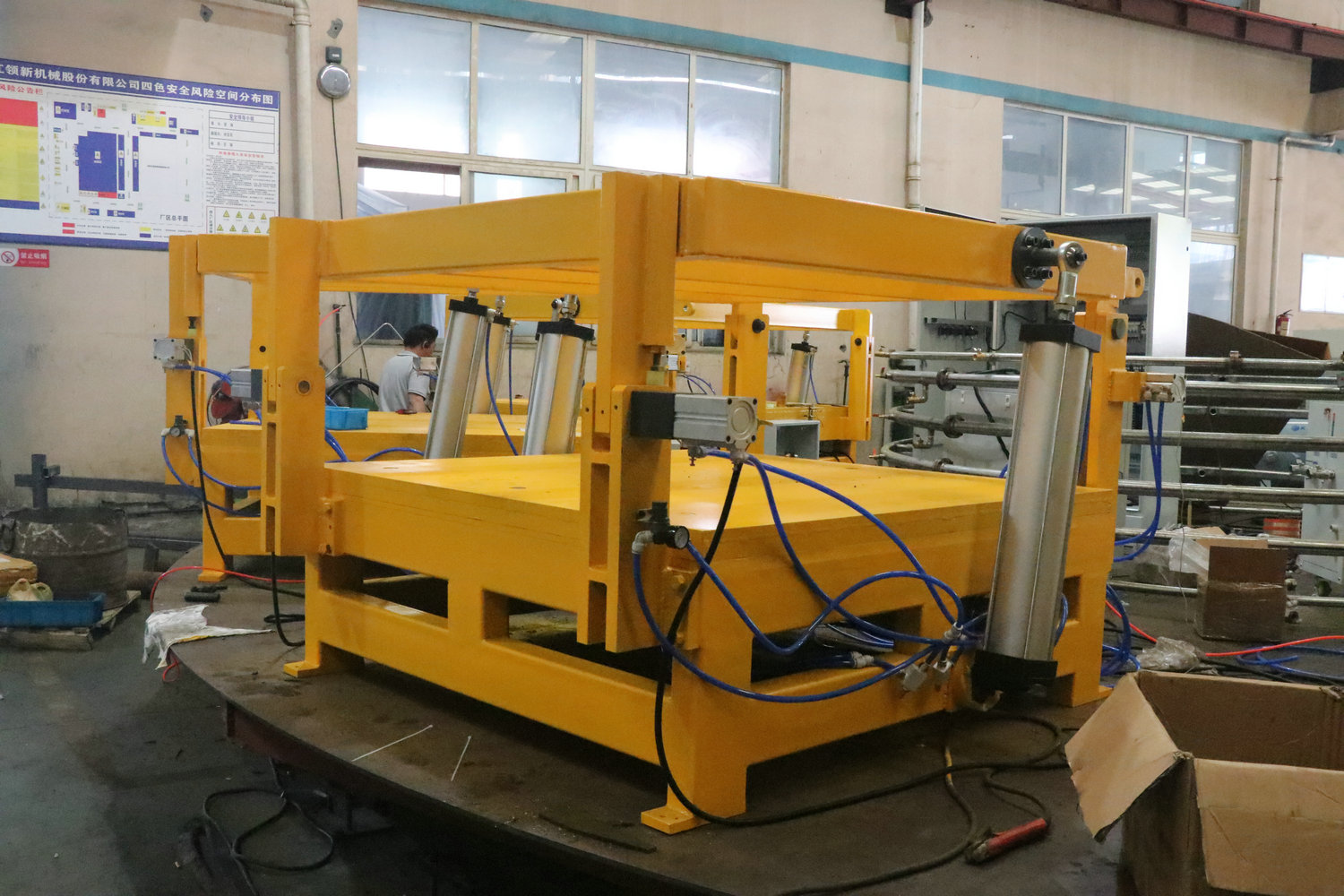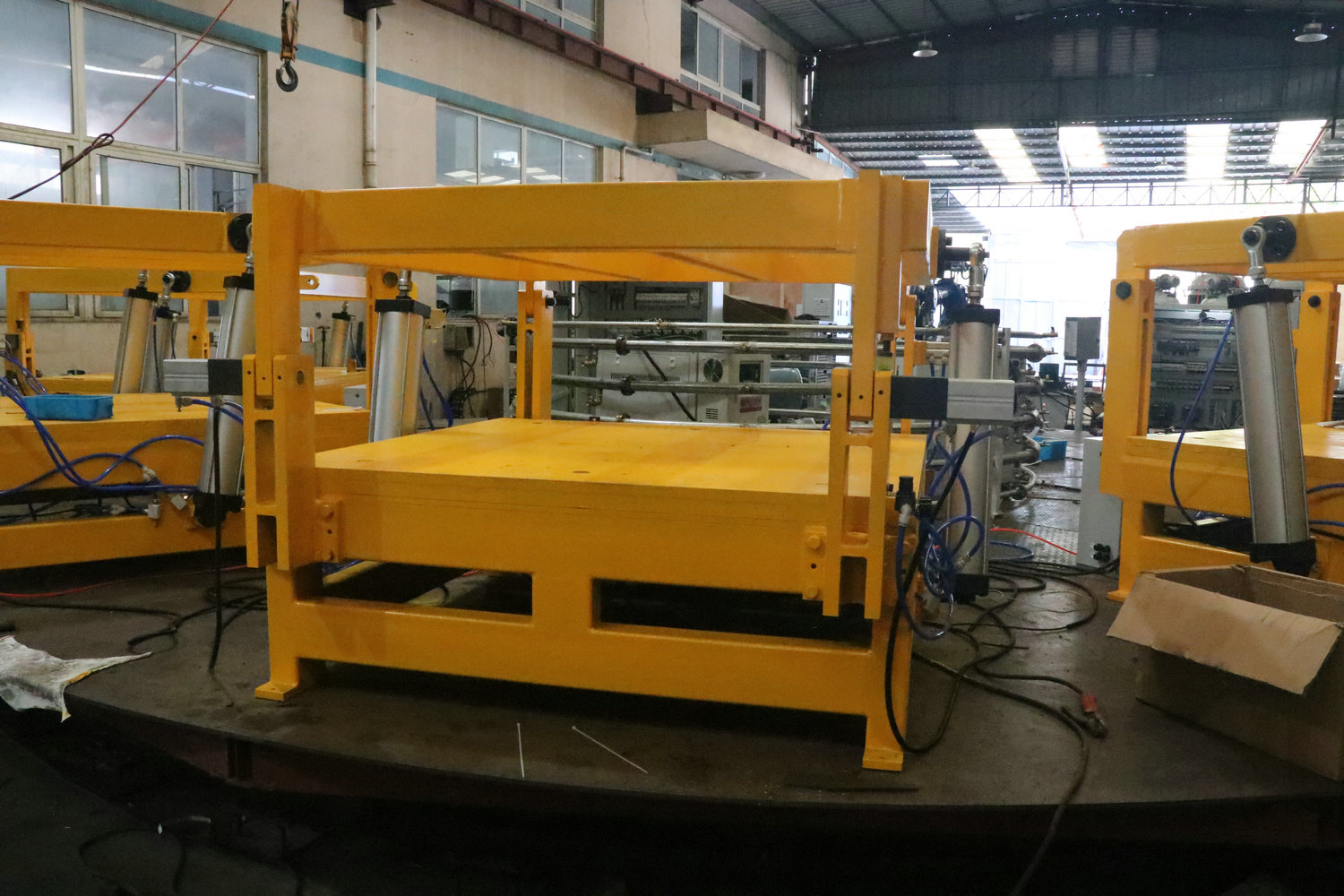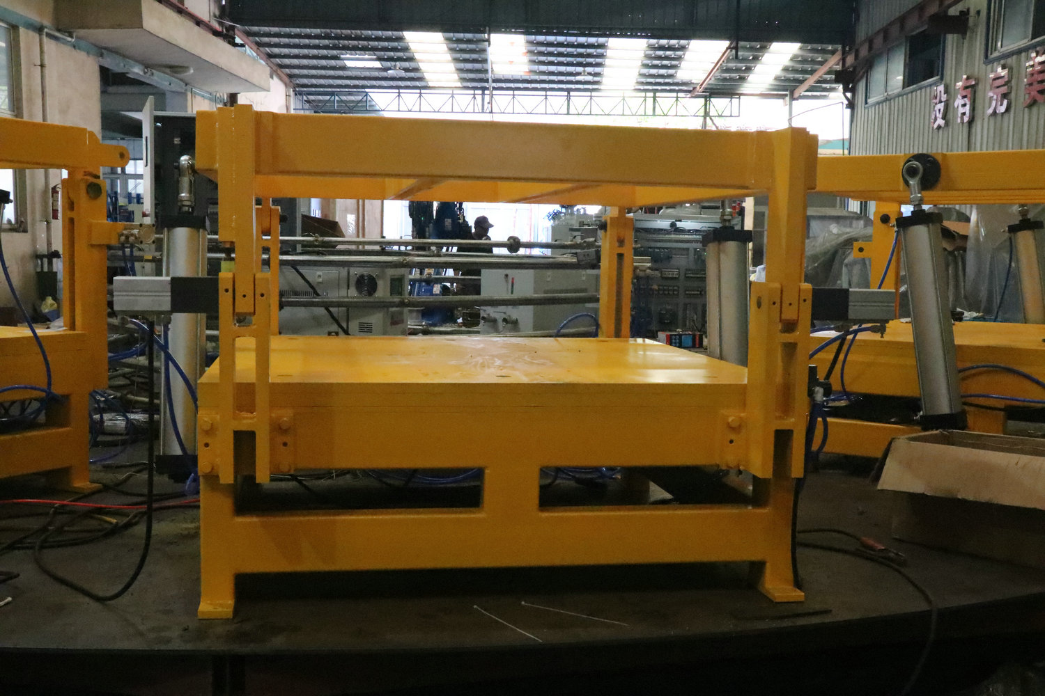 每個(gè)模架為獨(dú)立的控制系統(tǒng),單獨(dú)的PLC控制,模架多為固定,搭配聚氨酯發(fā)泡機(jī)使用,采用機(jī)頭固定澆注或機(jī)械臂澆注的形式進(jìn)行生產(chǎn)。